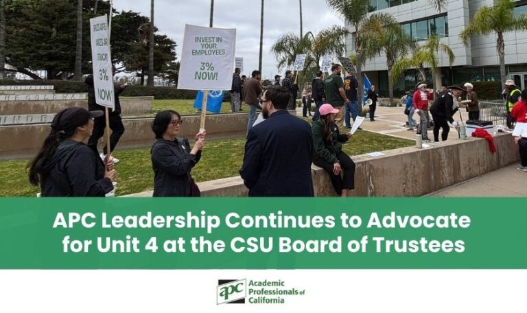 APC’s newly elected Executive Board thanks members for their participation and trust. As they begin their term, the Board is committed to strengthening the union, supporting stewards, improving communication, and advocating for fair compensation, job security, and better working conditions across the CSU.